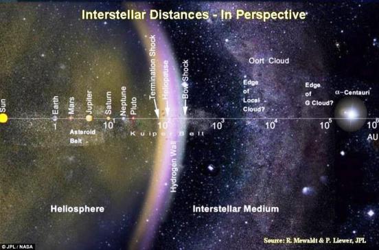 The closest star system to Earth is Alpha Centauri in the constellation of Centaurus, the third brightest in the sky. But because of the distance, it would take several thousands of years to reach it. The Centauri system is 4.4 light years away from Earth. A light-year is a unit of length in interstellar astronomy equal to the distance that light travels in one year (186,424 miles per second) for a total of 5,878,000,000,000 (about 6 trillion) miles traveled in one year.[1] To put interstellar distances into perspective, take a look at the picture on the left side; we can note the number 1 under planet Earth which represents 1 (AU) Astronomical Unit, the average distance between the Sun and the Earth (93 million miles).[2] Following down to the right, the number 101 is listed under planet Saturn which represents 10AU or about 891 million miles away from our sun. In perspective, the Oort Cloud which comprises many billions of comets, has a depth of 5,000AU to 100,000AU and is represented on the picture between 103 (1,000) and 105 (100,000) exponential factors of AU distance.[2]